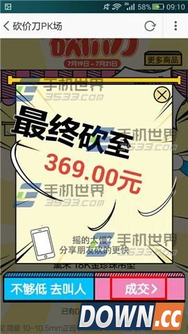 4)一直摇晃手机,在倒计时结束之后,就可以看到你最终将该商品砍至多少的价格了,如果满意,就点击【成交】进行购买,如果还想继续砍价,可以尝试点击【不够低 去叫人】然后分享给朋友让他们帮你一起砍价。(如下图)