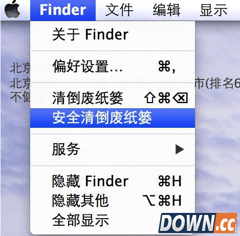 如果要删除比较敏感的文件,如电子银行对帐单、纳税申报单、包含身份证号或密码的文稿,可以选择让 Mac 以安全的方式清倒废纸篓。此选项可以使 Mac 覆盖已删除的文件,从而大大降低他人恢复这些文件的概率。此过程可能会花费一些时间,具体取决于删除的内容 安全清倒废纸篓 长时间按住Dock栏里的废纸篓图标,弹出的菜单就会出现“清倒废纸篓”的选项,而如果按住Command键,菜单中就会出现“安全清倒废纸篓”,点击它就可以了。你也可以先打开某个Finder窗口,然后在“应用程序”菜单里找到“安全清倒废纸篓”选项。
