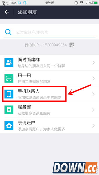 第四步:选择我们要添加朋友的来源,一般都是可以通过通讯录,手机联系人进行添加。