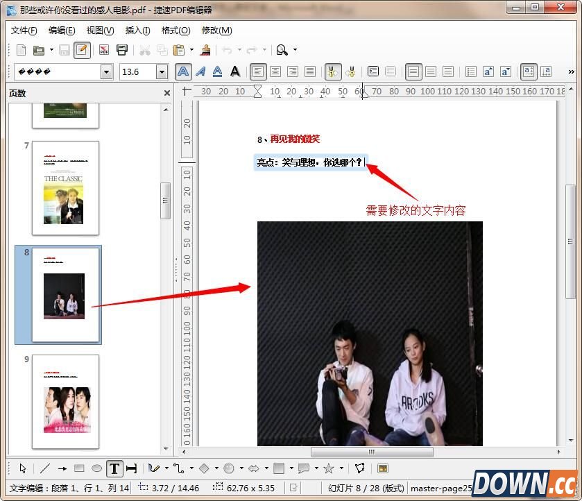 4、我们可以选择编辑器窗口中的页数栏选择需要修改文字的页面,然后在软件右侧就会显示该页面内容,大家可以使用鼠标选定需要修改的文字内容,然后进行删除或修改文字内容。