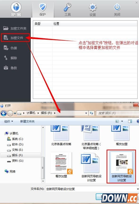 现在很多用户电脑中都有一些比较私密的文件,为了保护这些私密文件不会被他人随意打开或盗取,大家经常会在网上寻找一些文件加密软件对私密的文件进行加密。但是,现在网上很多加密软件都要收费,而且一些加密软件加密方式简单,网上随便一款解密软件都可以进行解密,另外,一些加密软件可能会盗取用户重要的文件资料,又有可能会将一些病毒、木马文件携带到用户电脑中,致使用户重要数据受损。对于这些情况,很多用户都曾遇到过,所以大家就在想,有没有一款免费文件加密软件,用户既不用担心文件数据安全,又不用担心被他人随意破解呢?对于大家的疑问,就让小编来为大家解答吧! 护密文件夹加密软件操作教程: 第一步:打开护密文件夹加密软件,选择针对“加密文件”按钮。点击后将弹出文件选择对话框,大家可以在对话框中找到需要加密的文件,然后点击“打开”按钮。