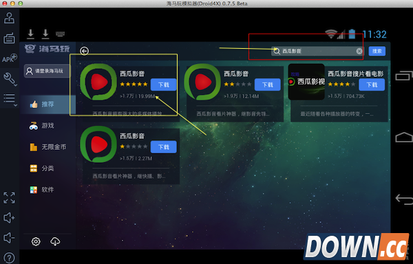 西瓜影音Mac版怎么用?有很多的用户就纳闷了,西瓜影音哪里来的Mac版,西瓜影音官方是没有Mac版的,但是不缺乏其他的方法可以在Mac上使用西瓜影音,小编使用的是海马模拟器Mac版,就能达到在Mac上使用西瓜影音的效果。 首先呢,大家必须下载一个海马模拟器Mac版,这个软件呢,安装使用都非常的简单,下面小编给大家提供一个下载地址的链接: 接下来,用户只需要根据软件的提示进行安装就行了,然后打开海马模拟器,进入“海马玩”,搜索“西瓜影音”: