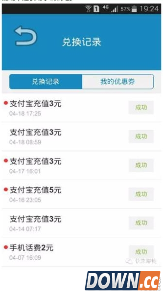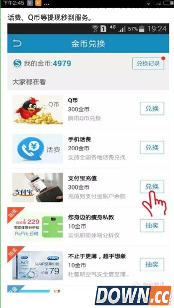 5、出来如下界面后点击兑换,即可享受支付宝、话费、Q币等提现秒到服务