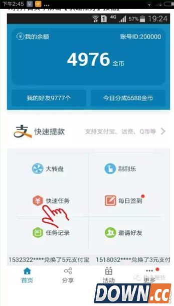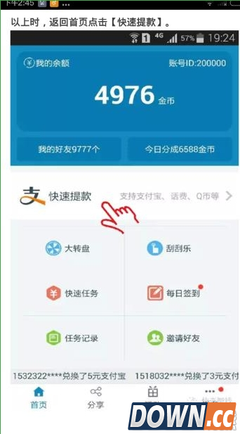 4、安装体验一两个任务后,当金币达到300也就是3元以上时,返回首页点击快速提款