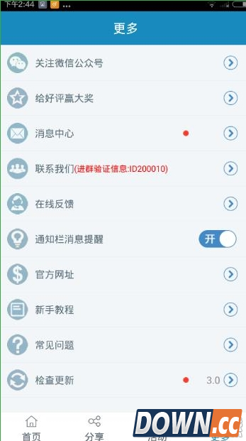 4、最后就是更多栏目,一些常见的问题介绍、消息等在这里都可以看到,有需要的用户可以下载试试