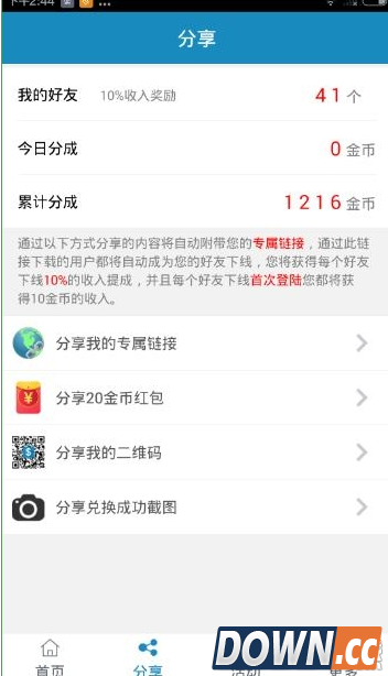 2、其次就是分享栏目,在这里,你将二维码、链接等成功分享给你的好友,就可以获得提成,累计金币