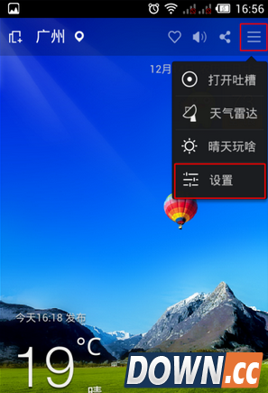 2、进入360天气主界面后,点击【右上角的菜单——选择——设置】