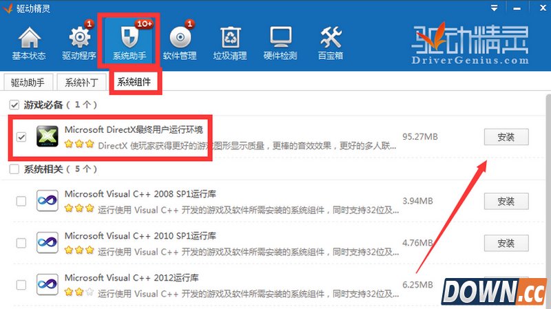 此外,小编建议大家更新一下“系统组件 DirectX”。切换到“系统助手”-“系统组件”选项卡,勾选“Microsoft DirectX最终用户运行环境”右侧的“安装”按钮,安装并更新此系统组件。