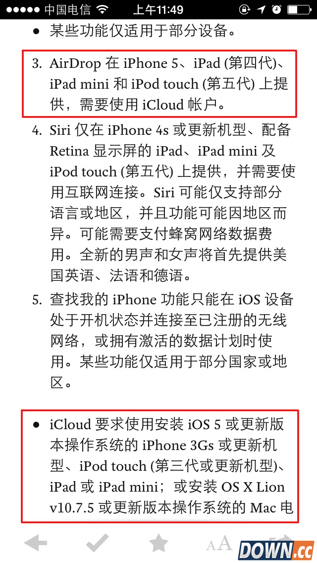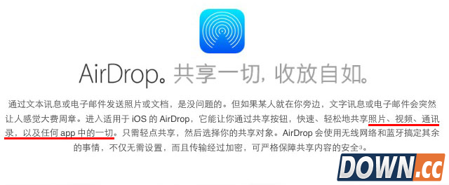 AirDrop是iOS7新增的主要功能,iOS设备之间可以通过AirDrop进行快捷的文件传输。值得注意的是,并不是所有的iOS设备都可以使用这项功能,目前AirDrop只在iPhone 5、iPad 4、iPad mini、iPod Touch5上提供,需要使用iCloud账户。也就是说,iPhone4s及同期产品均不支持AirDrop。