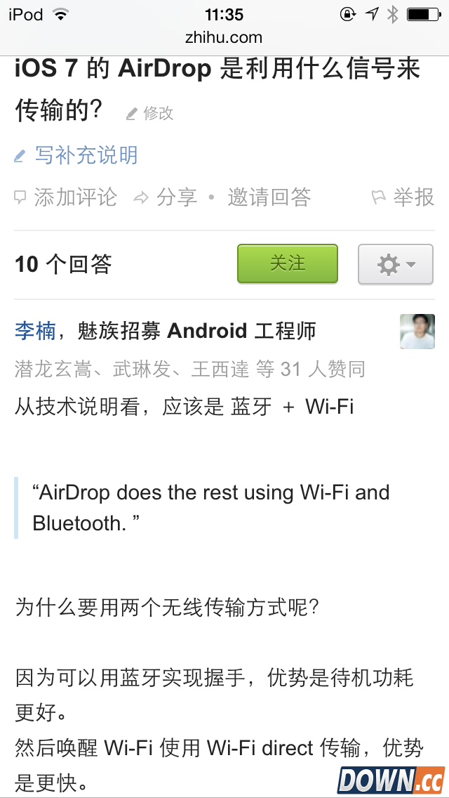 传输原理 在官方的说明文件里,我们可以发现AirDrop是通过蓝牙与wifi来进行传输。其中,蓝牙“握手”,wifi“传输”。整个传输过程,并不需要网络连接的参与。也就是说,即便你的iOS设备处于网络离线状态,依旧能通过AirDrop进行文件传输。 有兴趣的同学也可以把wifi、3G、蓝牙、AirDrop全部关闭,然后再启动AirDrop,观察wifi与蓝牙的变化。
