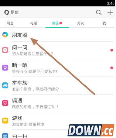 易信一款很好用的手机交友软件,朋友晒照片是很常见的事情了,现在我们的易信的朋友圈也可以升级刷语音了。下面小编就为家分享一下易信朋友圈怎么发语音 进入易信后,点击发现。操作方式跟几乎一样的路径,这也可能是为了照顾用户习惯,不用再花时间去熟悉一款软件的操作。直接搬来就行了。