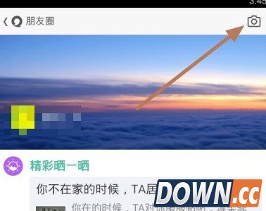 发送朋友圈消息也是同微信的位置一样,呵呵,点击右上角的相机图标。