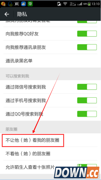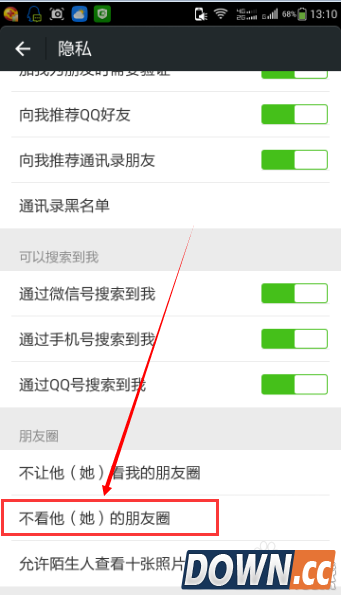 在“隐私”设置中的下方有一个“不看他(她)的朋友圈”的选项,点击进入。