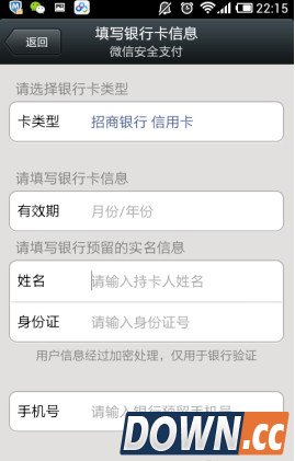 2、在填写银行卡页面,我们可以看到所添加银行卡的类型,填写银行卡的有效期,姓名,身份证号码,及手机号码,自动跳到验证手机号页面。