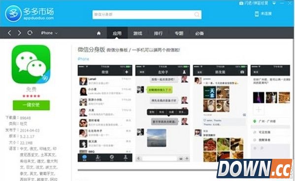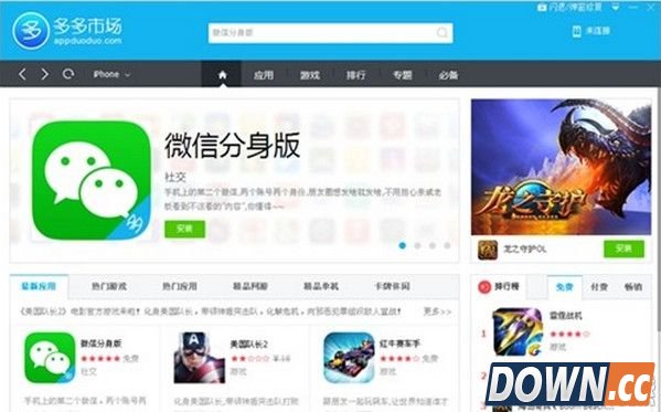 微信分身版是可以让你在同一个设备中登录两个微信帐号的软件,那么如何在iPhone里同时共用两个微信?只需下载安装【微信分身版】,便可在同一台iPhone上使用两个微信应用。 果粉们是否也有这样的烦恼?有两个微信账号,一个是对外的,一个是私人的,一个工作的,一个生活的。但是却不能同时登陆,来回切换很是麻烦。那么就在iPhone里安装微信分身版吧,它可以让你在同一台手机上同时使用两个不同账号的微信。 方法、步骤 方法一:直接通过本站免越狱安装。(推荐) 方法二:通过第三方助手进行安装。 1、首先,您需要进入多多市场官方网站下载多多市场,然后在里面您就可以下载、安装微信分身版。