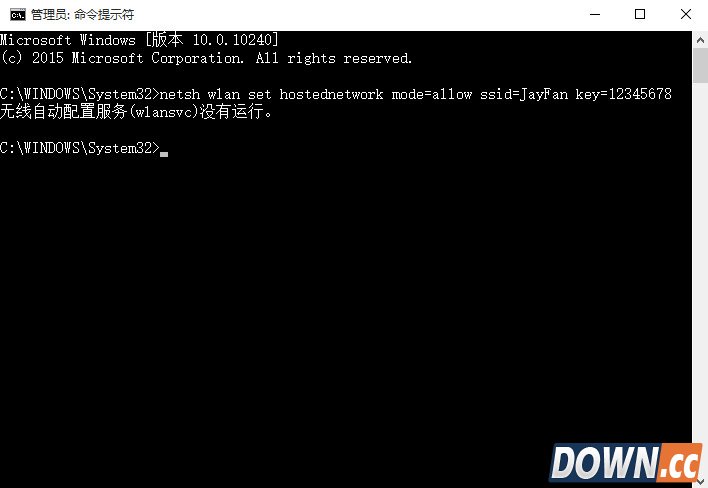 在命令提示符输入:netsh wlan set hostednetwork mode=allow ssid=JayFan key=12345678,回车执行命令。(当然,你可以直接复制命令,然后Ctrl+V粘贴到win10命令提示符中,因为win10支持命令提示符的Ctrl+v操作啦)。