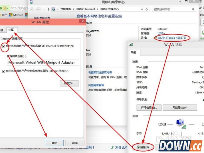 网络和共享中心,找到已正常连接Internet的网络,点击它,在属性中,选择“共享”,勾选其中的“允许其他网络用户通过此计算机的Internet连接来连接”。并且家庭网络连接选择虚拟wifi“Microsoft Virtual WIFI Miniport Adapter ”,单机“确定”。如下图。