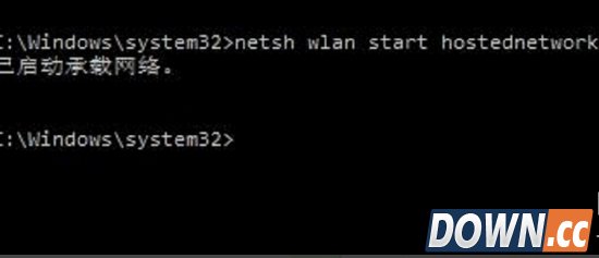 稍等片刻,在刚才打开的管理员权限的命令提示符中输入:netsh wlan start hostednetwork并回车。