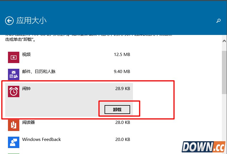 在”应用大小“中我们可以看到我们安装的应用。 例如我想把”闹钟“应用卸载。我们直接点击”闹钟“选择”卸载“就可以了