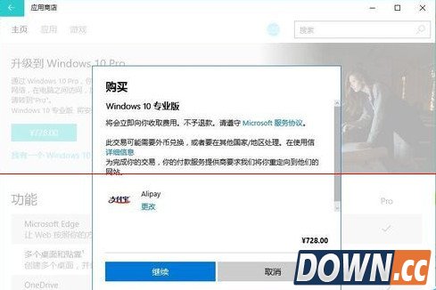 7、购买更专业版Win10升级,现在也是支持支付宝。点击【继续】这样就会提示支付宝二维码支付的界面。支付成功就会购买成功。