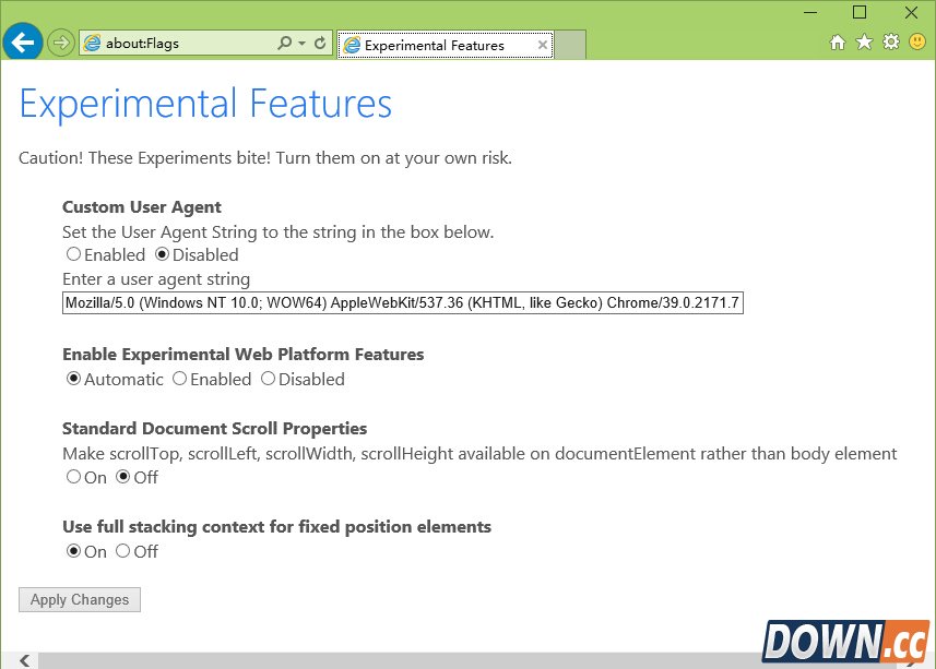 Windows 10 发布之后,我也第一时间更新了,然后发现了一个隐藏的功能。就是在Win10自带的IE11里面输入about:Flags 就可以自定义User Agent,还可以启用微软的最新斯巴达内核。 如下图: